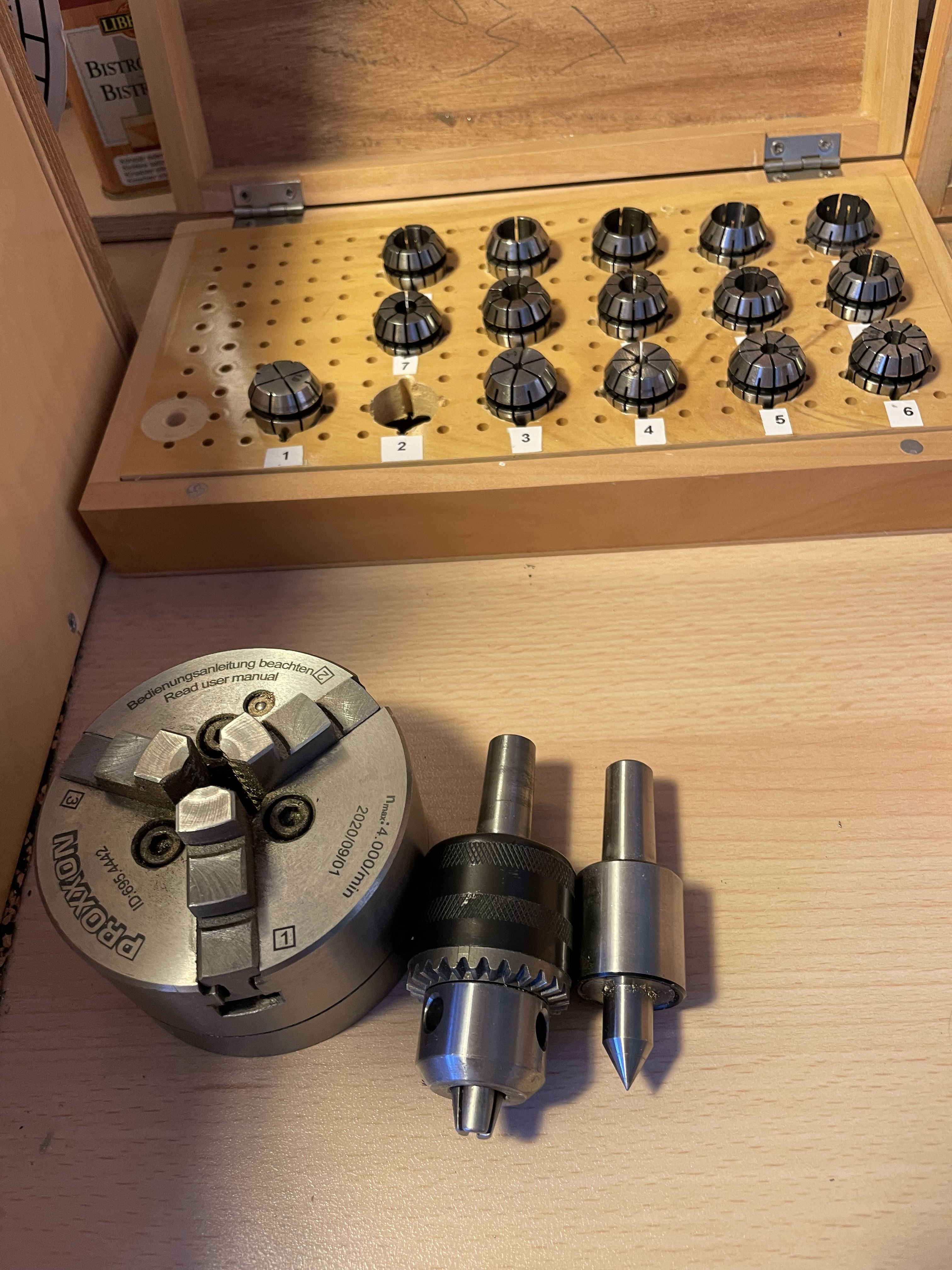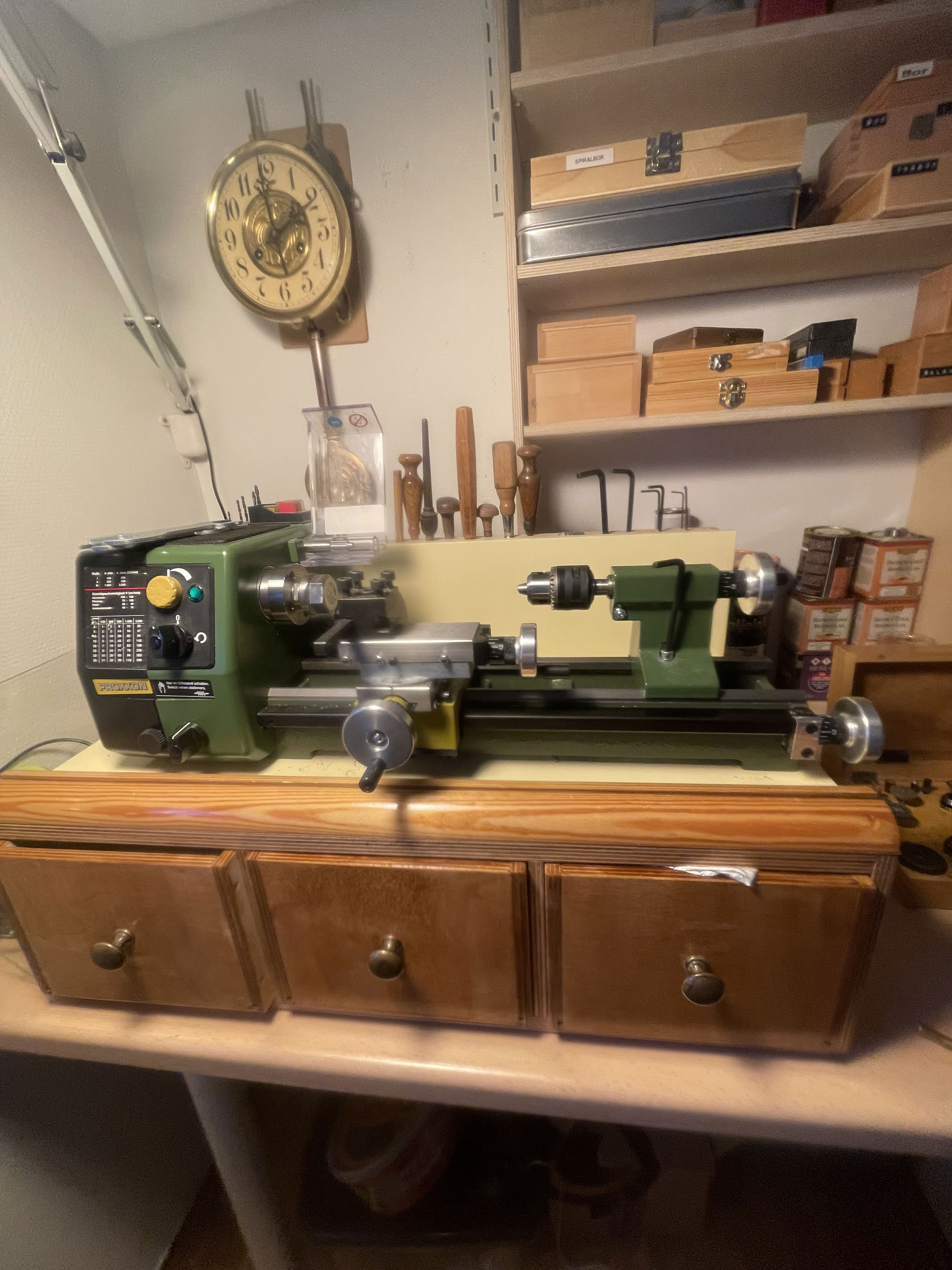 Lite brukt dreiebenk med en god del utstyr, se bilder. kr. 18000,-, liten benk med rygg og 3 skuffer. Se bilder for utstyr som følge med.
